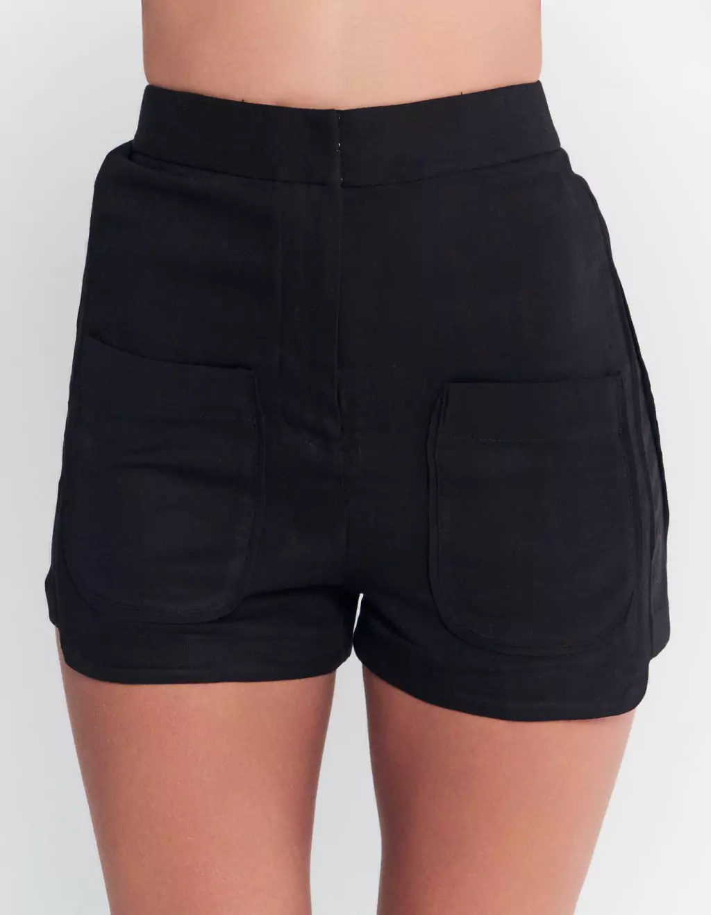 Short cintura alta todo trabalho com acabamento externo nas extremidades feita de uma técnica chamada “vivo”. Fechamento por colchete e zíper embutido, bolsos frontais. As laterais do short buscam imitar uma prega fêmea, porém sem volume, achatado. Combine com Blusa Fenda para um look fresco e confortável.